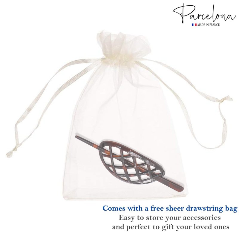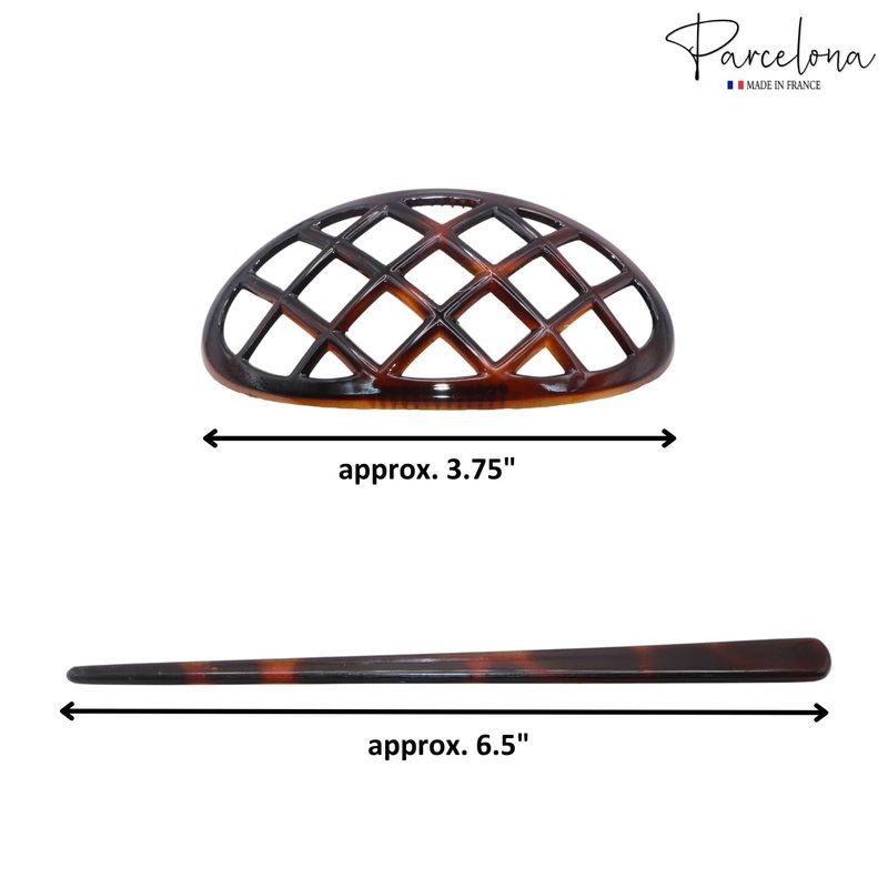 Parcelona French Criss Cross Pattern Tortoise Shell Brown Cellulose Acetate Made in France Chignon Bun Cover Ponytail Holder Hair Slider Pin Thru Updo with Stick for Women and Girls