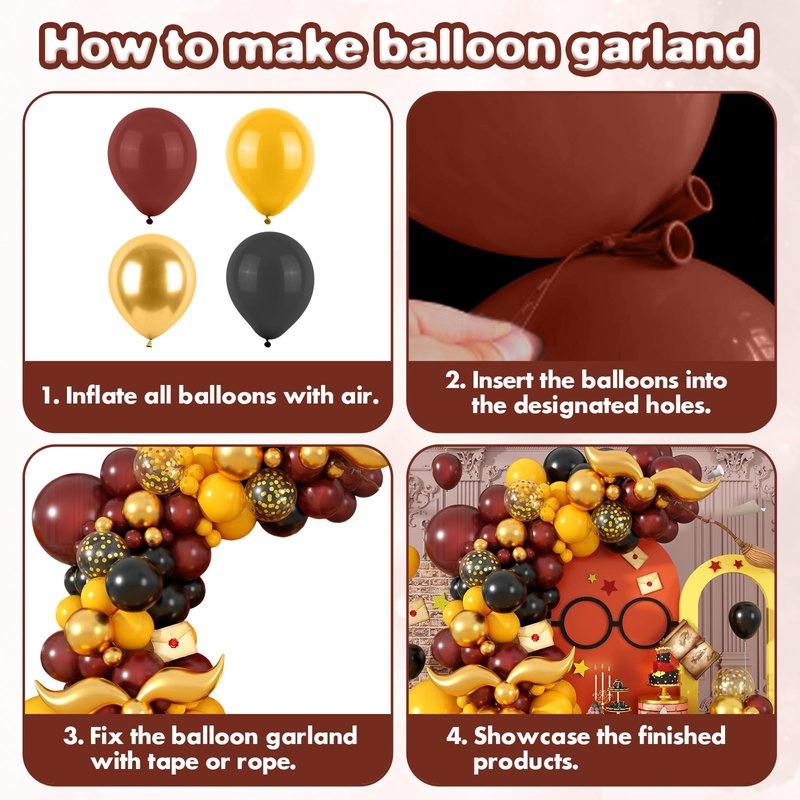 - 【WHAT YOU WILL GET】Our 120pcs Magical School Balloon Arch Garland provides 5 inch / 10 inch / 12 inch / 18 inch latex foil balloons: black balloons (12" x 15, 10" x 10, 5" x 10), burgundy red balloons (18" x 1, 12" x 7, 10" x 12, 5" x 13), retro lemon yellow balloons (18" x 1, 12" x 7, 10" x 10, 5" x 10), metallic gold balloons (10" x 5, 5" x 10), confetti gold balloons (12" x 5), gold s-shaped tail foil balloons (18" x 4), balloon chain (5m x 1), balloon dispense (20/sheet x 2).