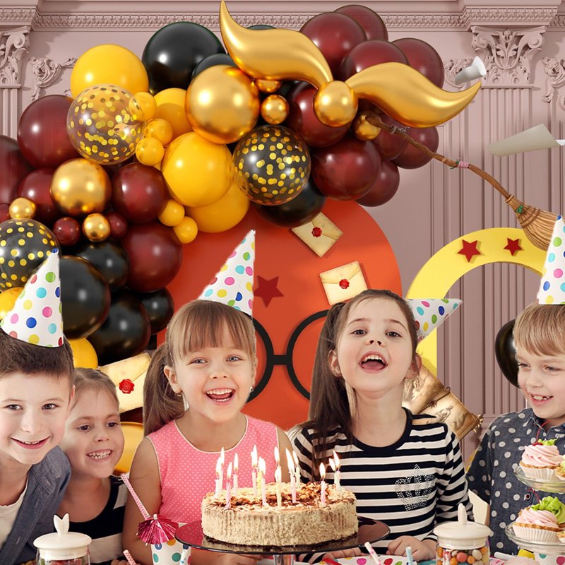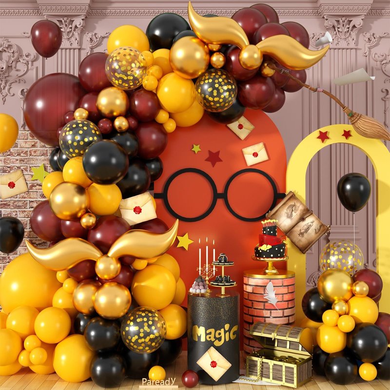Paready Magical School Balloon Arch, 120 Pcs Wizarding World Balloon Garland, Black Burgundy Red Yellow Metallic Confetti Gold S-shaped Tail Foil Balloon for Kids Birthday Magic Theme Party Decoration