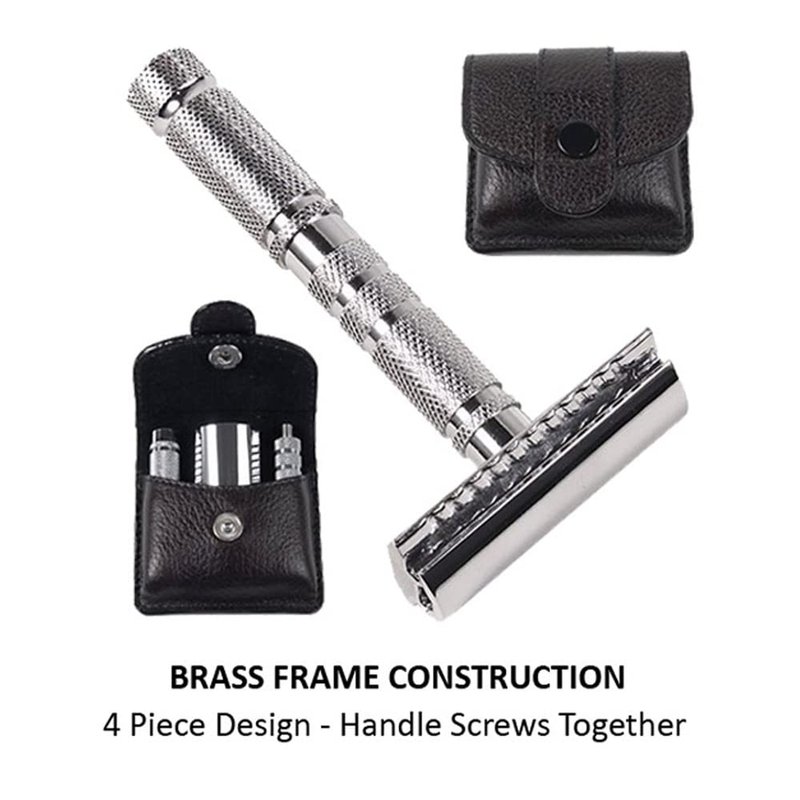 - HANDMADE FOR HIGH PERFORMANCE: This double edge travel safety razor is hand crafted for superior quality. The textured metallic handle offers a firm grip even with wet soapy hands.
