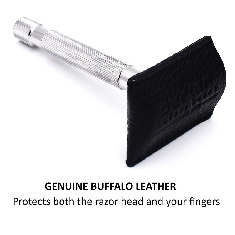 This high quality razor cover from Parker Safety Razor is made of genuine leather to protect your razor head and blade. This sheath will fit on all standard, butterfly, 3-Piece, and adjustable safety razors from all major manufacturers.