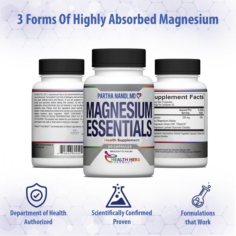 Experience the excellence of our Triple Magnesium Complex dietary supplement, a breakthrough magnesium complex meticulously formulated by Dr. Partha Nandi—an acclaimed Gastroenterologist and Emmy-winning TV show host. With his extensive medical expertise and passion for health education, Dr. Nandi brings you a magnesium pill that combines three highly absorbable forms: magnesium citrate, magnesium malate, and magnesium glycinate. Each serving delivers 235 mg of elemental magnesium designed for optimal absorption and bioavailability. Our magnesium vitamin was crafted with sensitive stomachs in mind, this magnesium complex reflects Dr. Nandi's commitment to digestive wellness. Whether you're seeking to support overall wellness or looking for a high-quality magnesium supplement, trust in a product that embodies excellence and credibility. Our formula is non-GMO, gluten-free, and manufactured in the USA in a GMP-certified facility, ensuring the highest quality standards. Elevate your wellness journey with a supplement backed by a respected medical professional celebrated both in the medical community and on television. We think you'll say what our fans tell us, "This is the best magnesium supplement of the market."