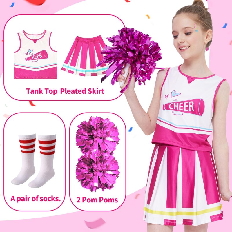 - Complete Cheerleader Ensemble: Give your little cheerleader everything she needs with this vibrant costume set, featuring a top, skirt, two pom poms, and a pair of striped socks for the full look.