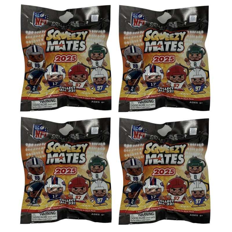 4 Blind Packs, Squeezymates NFL Squeezymates NFL Series 7 features NFL Greats in their uniforms. This blind pack bundle includes 4 Blind Packs, for a total of 4 NFL figures.