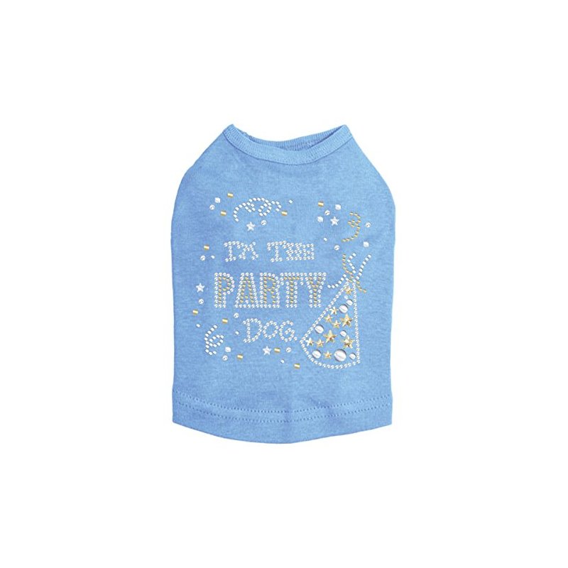 Party Dog rhinestone dog tank for large and small dogs. 4" X 4" design with clear, silver, & gold rhinestones, rhinestuds, & nailheads. Matching rhinestone t-shirts for pet owners.
