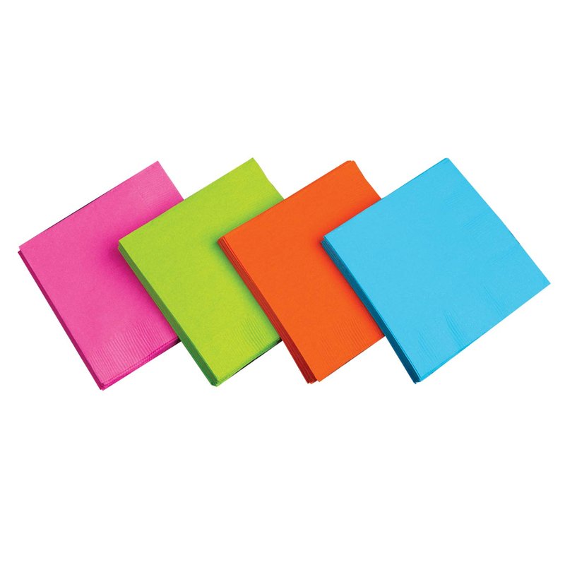 - 24-count package of 2-ply paper dinner napkins in assorted Neon Bright's; green, blue, orange and hot pink