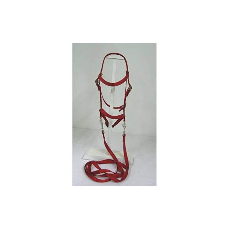 YOU'VE ASKED FOR IT, AND HERE IT IS! BITLESS BRIDLE Brow band bridle with undropable snap on rein. MADE IN THE USA Fits Mini's and Ponies utilizing a bridle that measures 34" from bit port, around ears, to other side, at largest setting. 25" at smallest. Two-point adjustment. This bridle is not intended for animals that need a bit for control, but for the animal that it makes no difference to! Great tool for leadline, and to keep children from being to rough on the animals mouth. This bridle, as in all equipment with children, should be used under constant supervision. Comes is all colors shown
