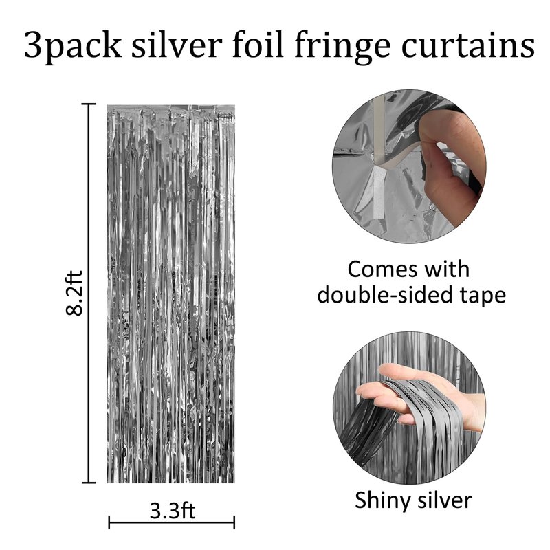 - [Value Pack] 3 pack Silver fringe backdrop, extra large size (width x drop) 3.3 x 8.2 ft each. With this black foil curtains , you can make an elegant entrance curtain for your guests.