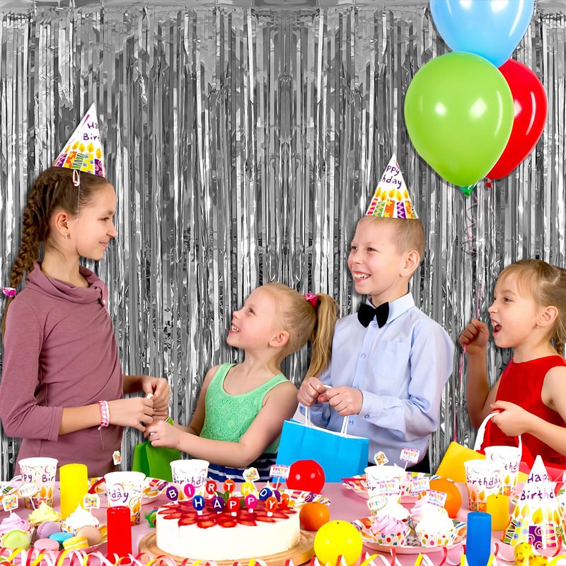 3 pack Silver fringe backdrop, extra large size (width x drop) 3.3 x 8.2 ft each. With this black foil curtains , you can make an elegant entrance curtain for your guests.