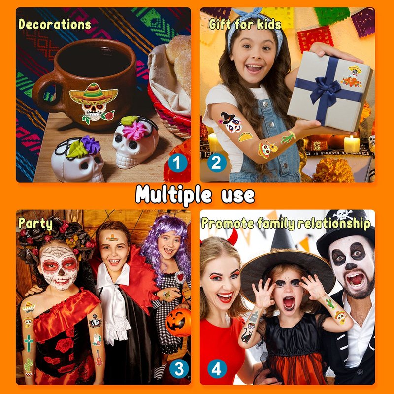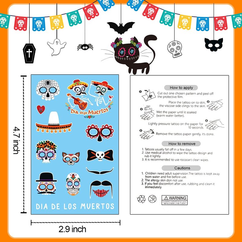 - 【Standard Quality】The Day of the Dead temporary tattoos are made of good quality material and no chemical odor. Safe and environmentally friendly materials that do not cause allergies. Very suitable for kids and adults to play and share with friends.