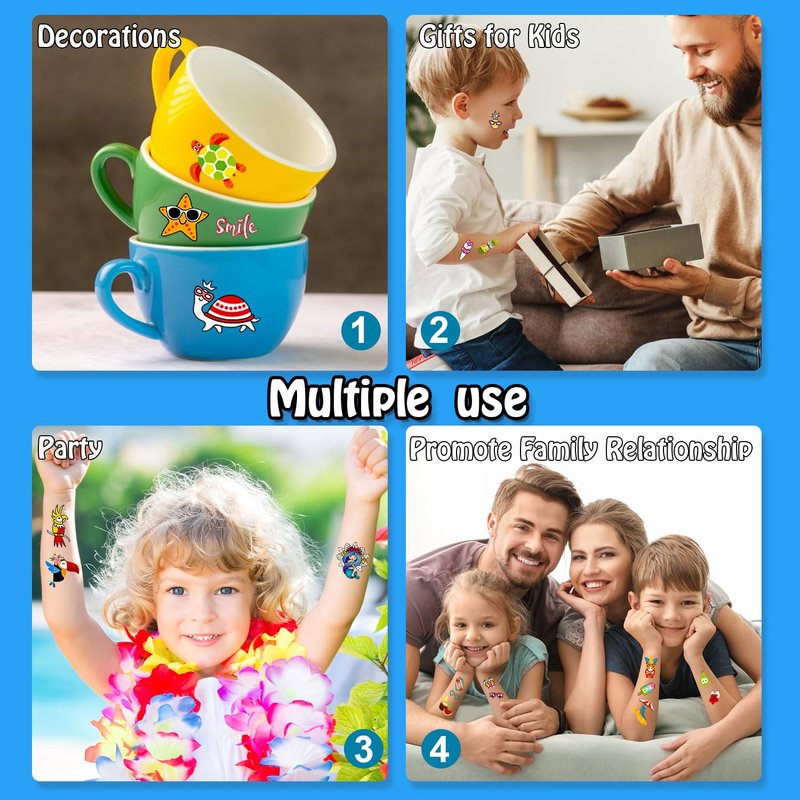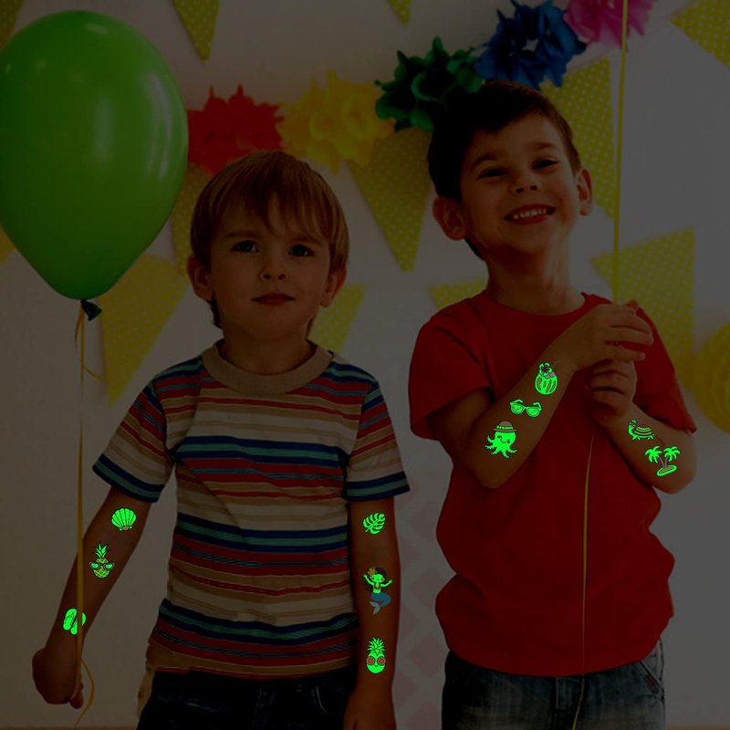 • 【Applicable Place】These glow temporary tattoos are suitable for Hawaiian/luau/tropical/pool/beach kids party supplies, birthday party decorations, party favors. You can also apply them to your body or some smooth objects, such as glass, tile, water bottle, plastic, mobile phone case and so on.