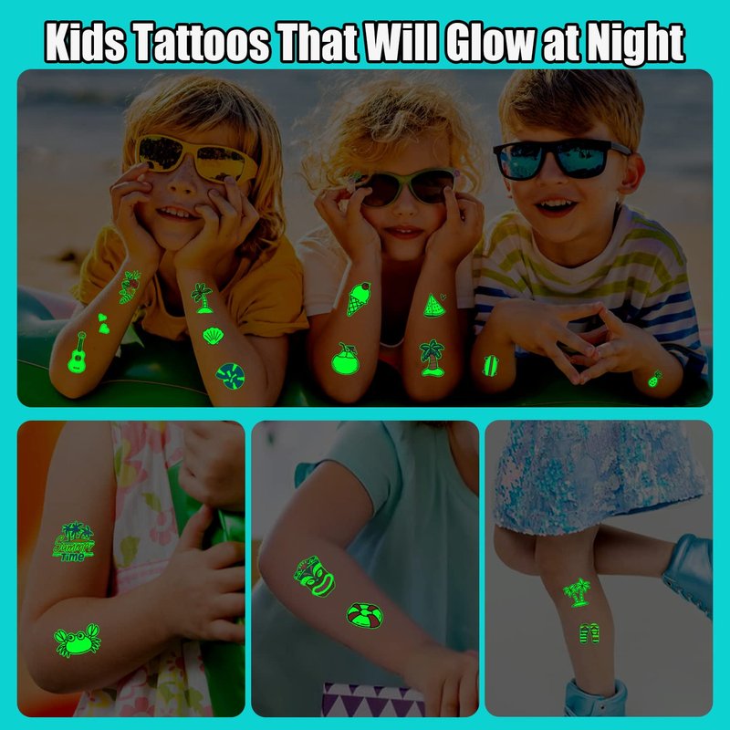 - 【Glow Hawaiian Tattoos for Kids Party Decorations】Super cute luminous luau tattoos for kids. Even at a party with lots of people, these glow tattoos will make you unique in the crowd! The tattoo features a novel and creative design and various popular Hawaiian theme elements such as Pineapples, Flamingo, Hibiscus Flowers, Palm Trees that kids like.