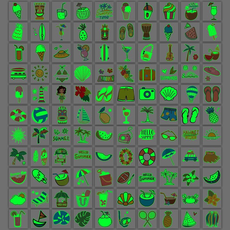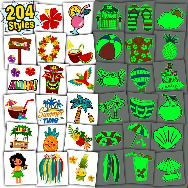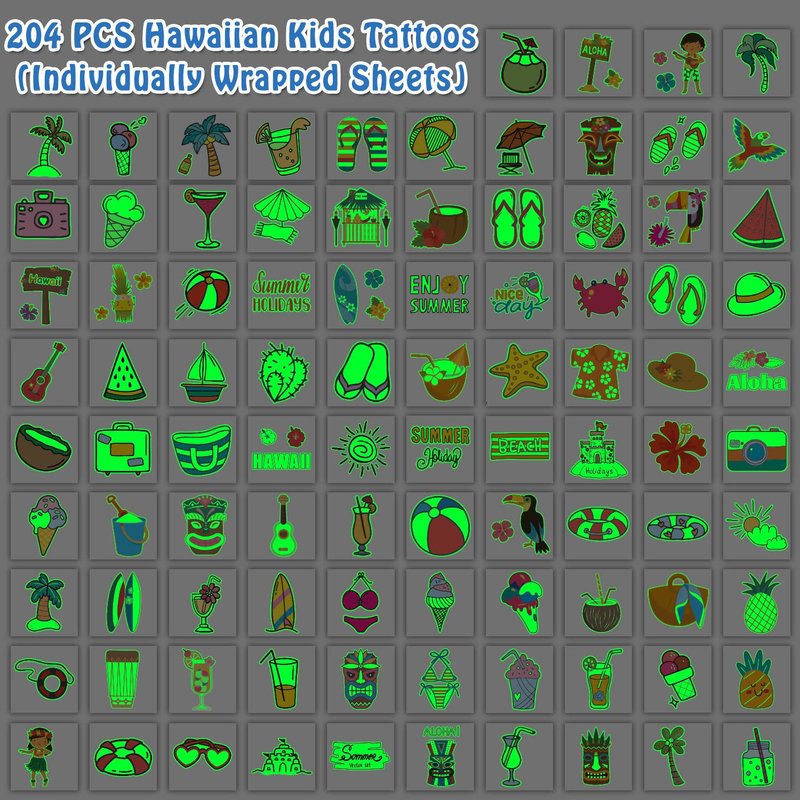 There are 204 styles luminous Hawaiian kids tattoos in the package! (Individually Wrapped Sheets)