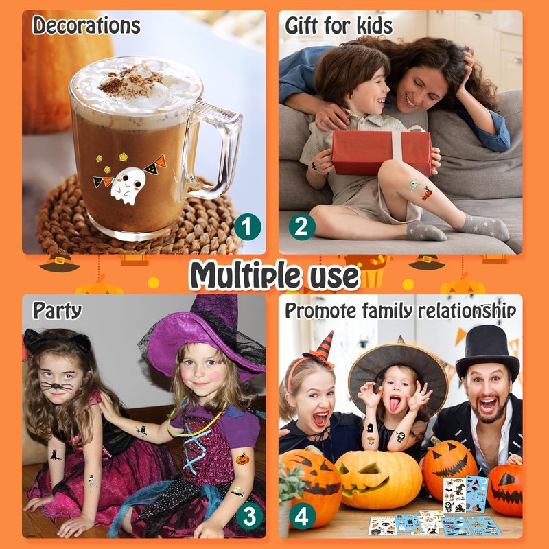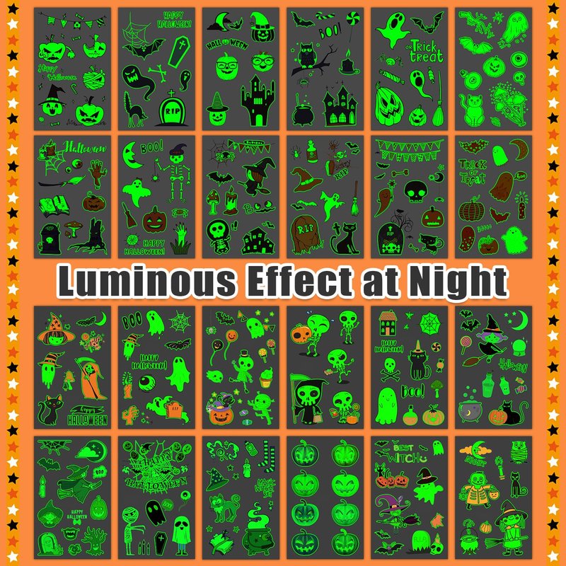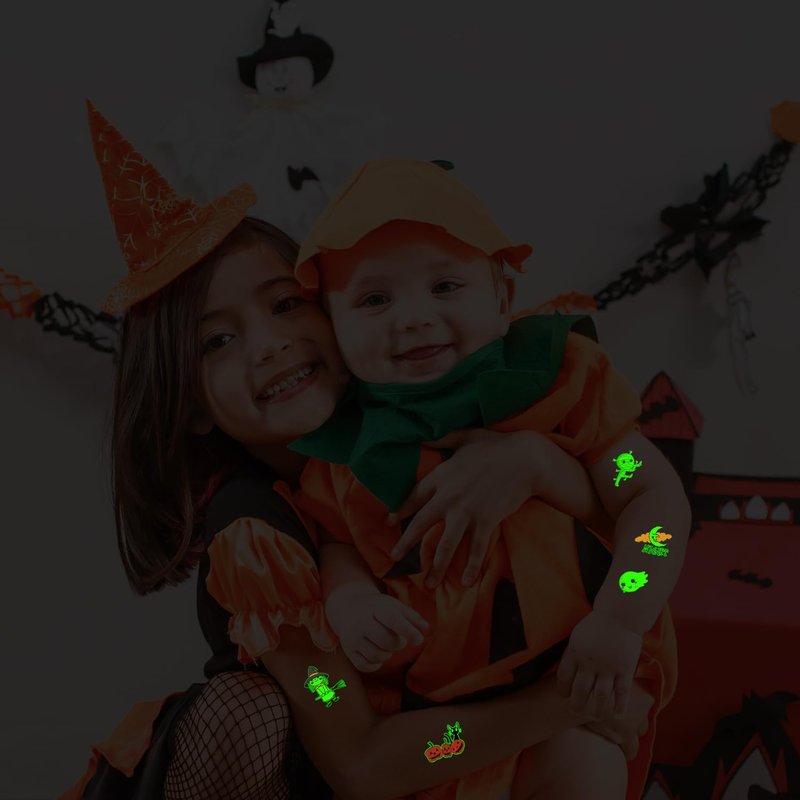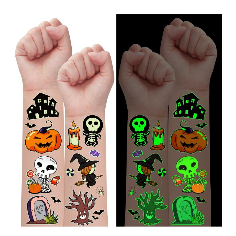- 【Luminous Halloween Tattoos for Kids Party】Even at a night party with lots of people, these luminous tattoos will make you unique among the crowd! These super cute elements in our Halloween fake tattoos include zombies, skeletons, vampire, pumpkins, witches, lanterns, black cats and other Halloween-related patterns!