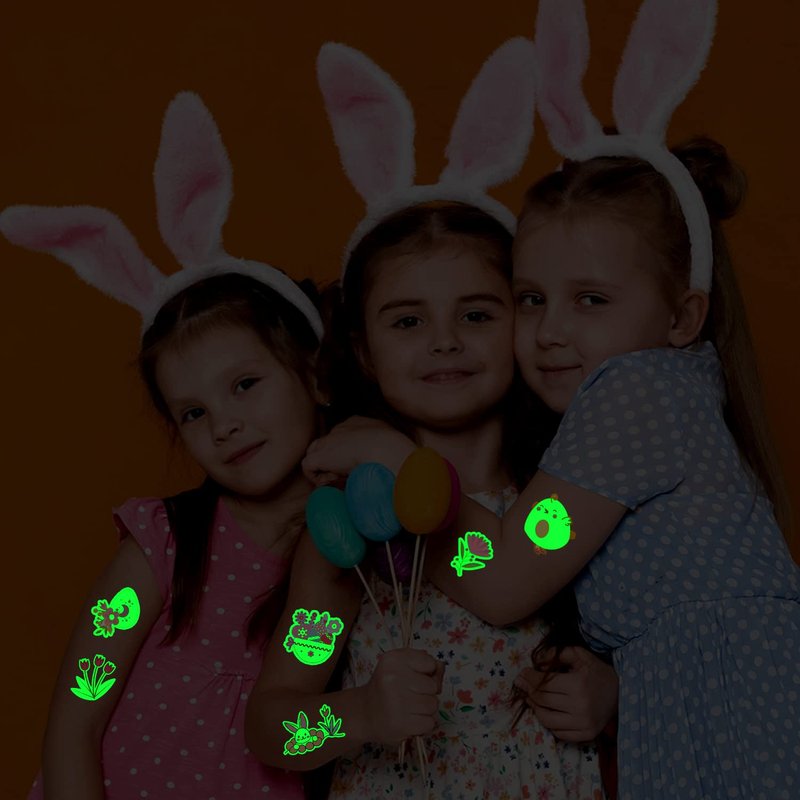 - 【Luminous Easter Tattoos for Kids Party】Various luminous Easter temporary tattoos for kids with rabbits, Easter eggs, flowers, chicks, and other favorite patterns that kids will love! These glow tattoos will make you unique in the crowd!