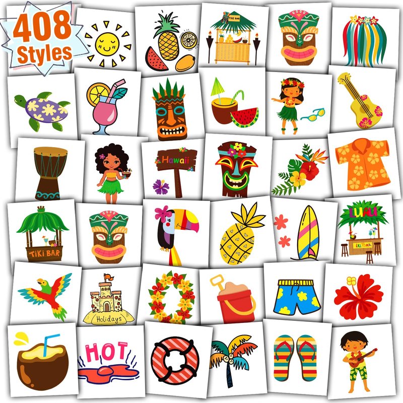 Partywind 408 PCS Hawaiian Tattoos for Party Decorations, Hawaiian Luau Party Favors Supplies for Boys and Girls, Beach Tropical Tattoos for Party Games (Individually Wrapped Sheet)
