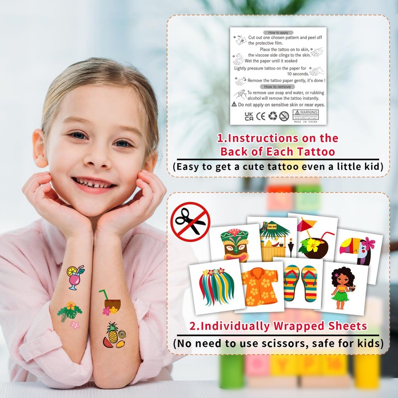 - 【Individually Wrapped Sheets】Partywind Hawaiian tattoos are individually wrapped sheets, they are easy to carry and can be distributed to kids individually. There are 408 different patterns in one set, which means that every child at the party can get a cute tattoo. No need to use scissors and this keeps the children safe while they play.