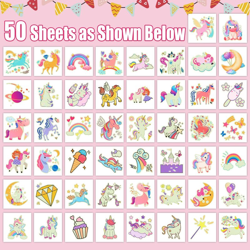Partywind Temporary Tattoos for Girls, 50 Styles Luminous Tattoo Stickers for Kids Party Supplies Decorations will Glow at Night, Birthday Goodie Bag Stuffers for Children Party Favors