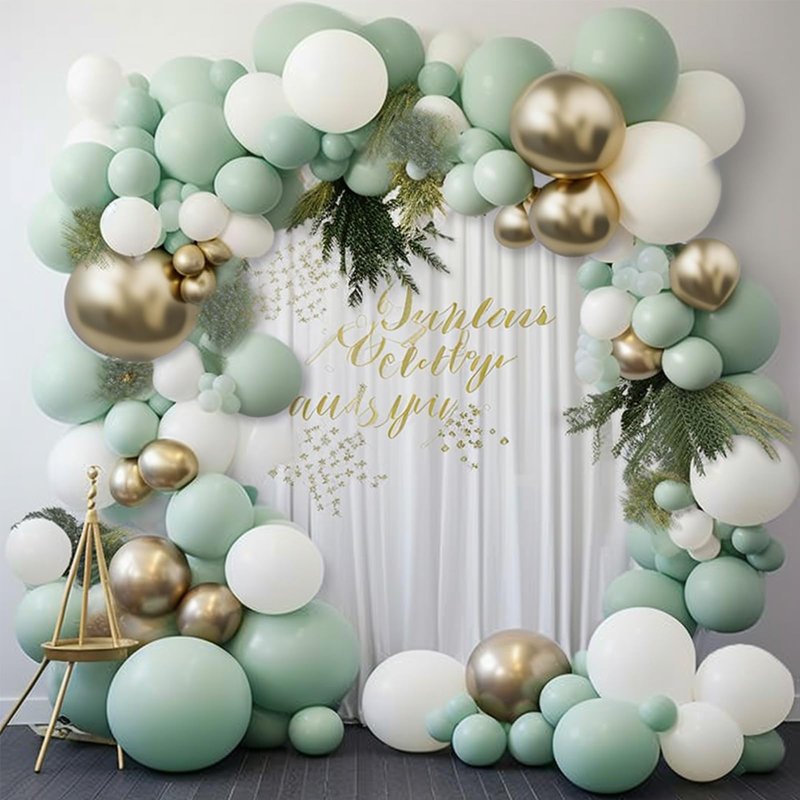 - 140 PCS BOHO GREEN AND GOLD BALLOONS DIFFERENT SIZES: Package includes 18 inch balloons 4 pcs, 12 inch balloons 30 pcs, 10 inch balloons 50 pcs, 5 inch small balloons 55 pcs, balloon decorating strip kit 1 set