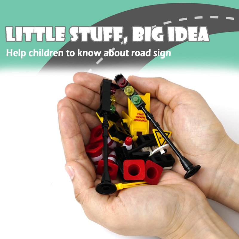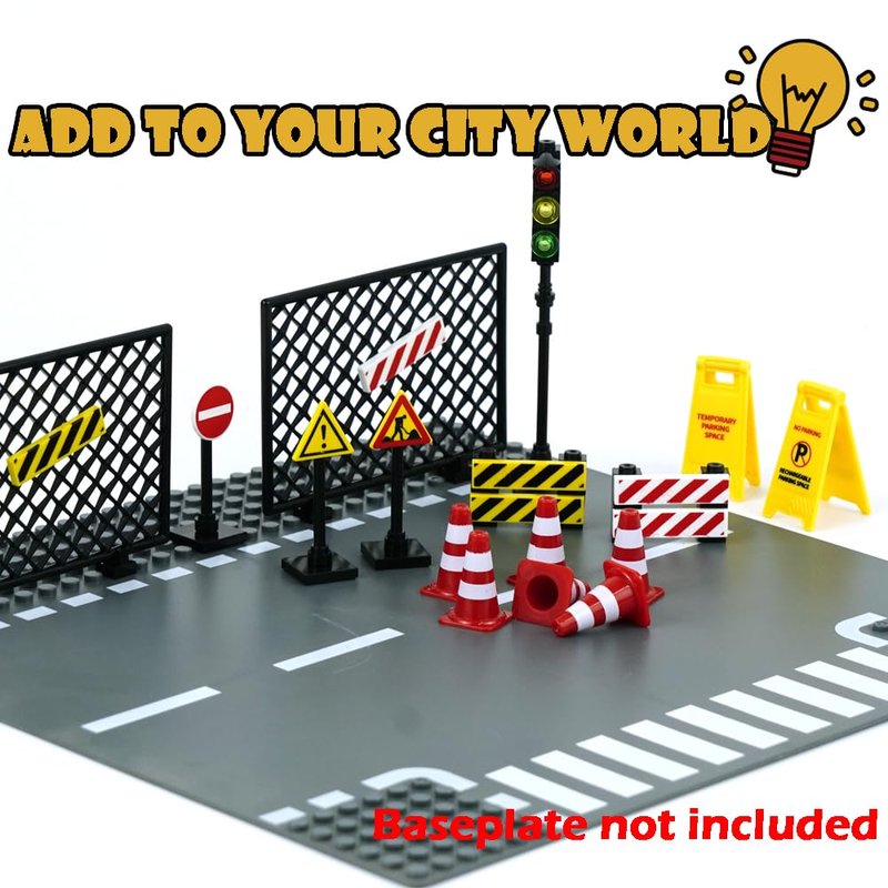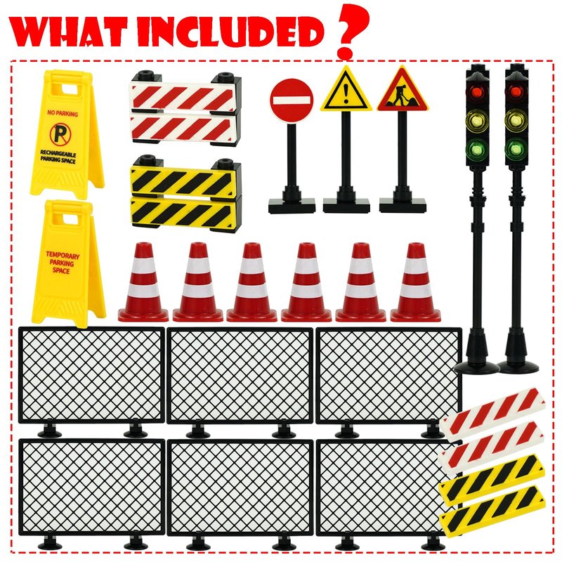 - 【Various Accessories】Our Road Signs Bricks Pack include traffic cones & crosswalk signal, construction site street signs, wire entanglement and traffic lights. You will get all in the first picture.