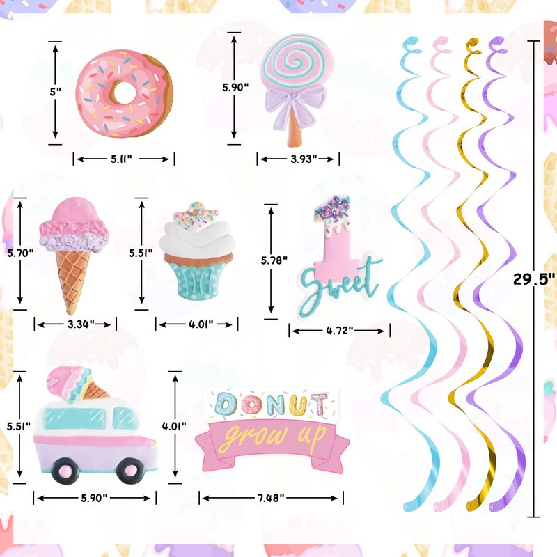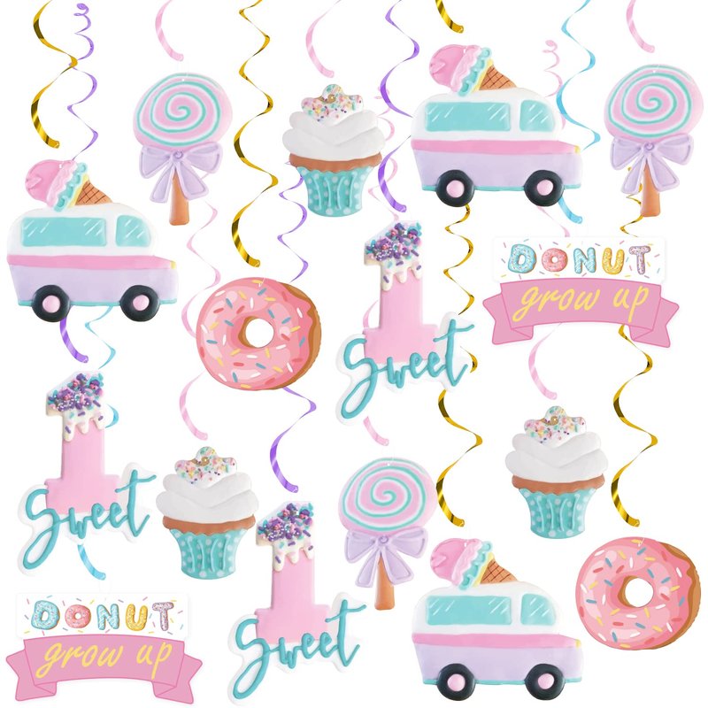 - 🍦🍩🍨【Sweet One Birthday Hanging Swirl】Package contents 20pcs hanging swirls,6 kinds of ice cream and donut design cutout hanging swirls;4pcs sweet 1 cut-out;3pcs donut grow up cut-out;3pcs candy cut-out;3pcs ice cream cone cut- out;3pcs donut cut-out;4pcs ice cream truck cut-out;Its charming designs and colors will definitely light up your toddle's birthday.