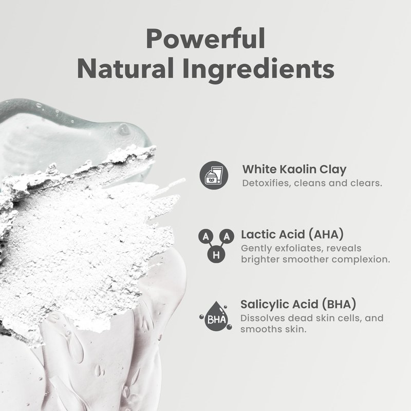 - EXFOLIATES & SMOOTHES: Infused with White Kaolin Mud, Lactic Acid (AHA), and Salicylic Acid (BHA), this face mud mask gently exfoliates and smooths your skin. Combining the benefits of a cleansing face mask and clay face mask, it leaves your skin looking radiant and refreshed.
