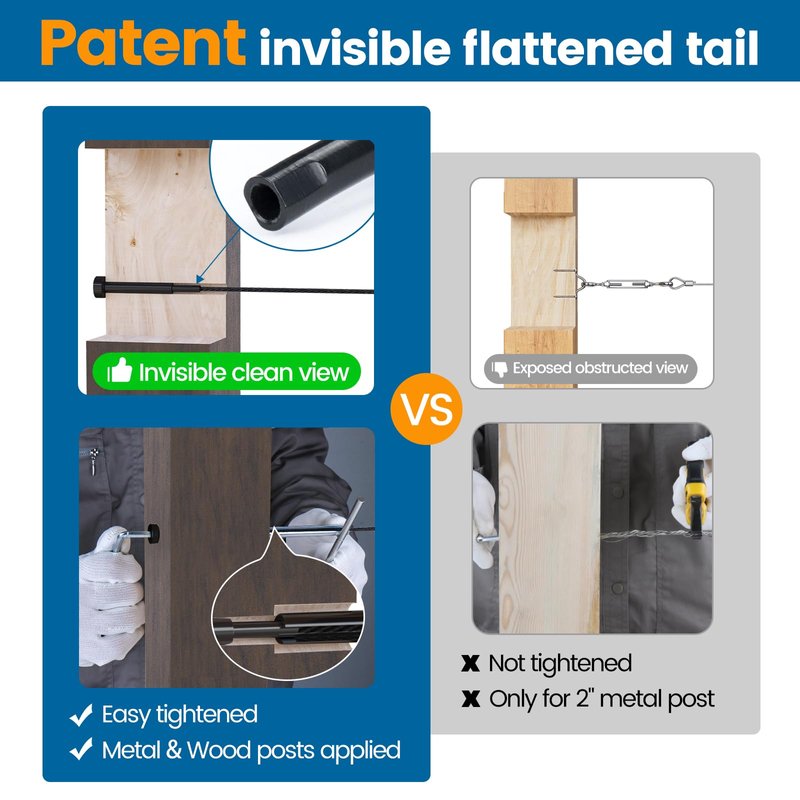 - Patented Invisible Design for 4"x4" Wood Post - With the patented invisible flattened tail design, the ugly swaged end can be hidden in the 4"x4" wood post(but cannot be hidden in 2"x2" posts), and get enough tension to pass 4” sphere test to meet code compliance. The customized socket wrench Muzata CT16 is essential for the invisible installation and keeps the cable from spinning when tightening. Package includes: 20 pairs of tensioners and terminals,1pc allen wrench