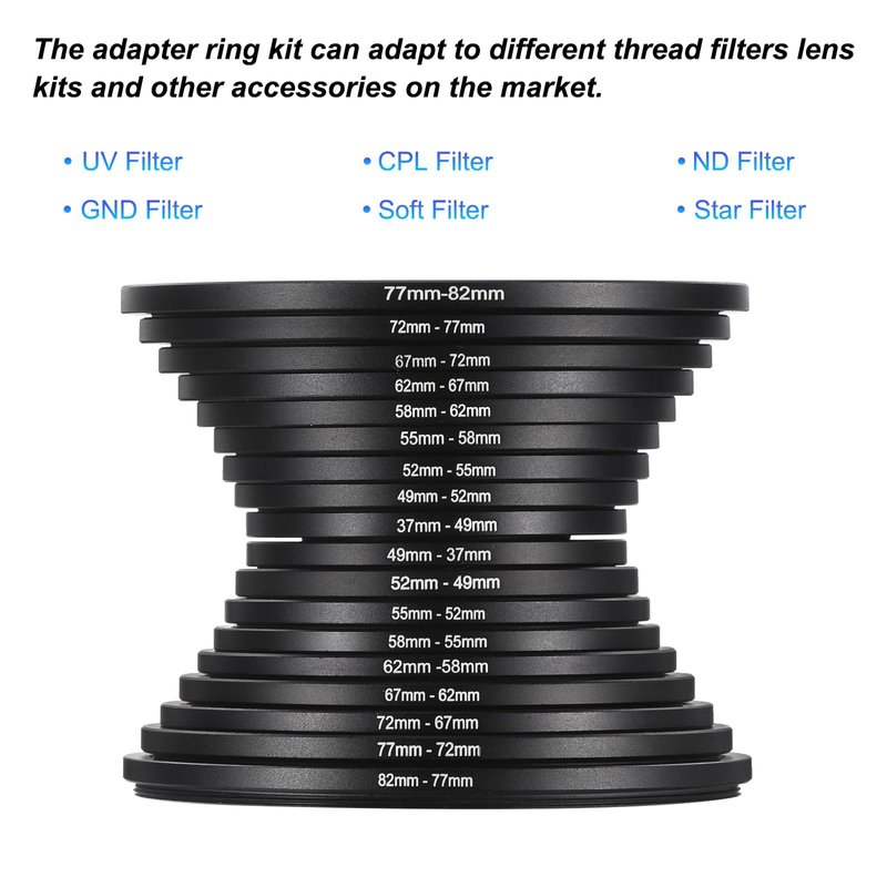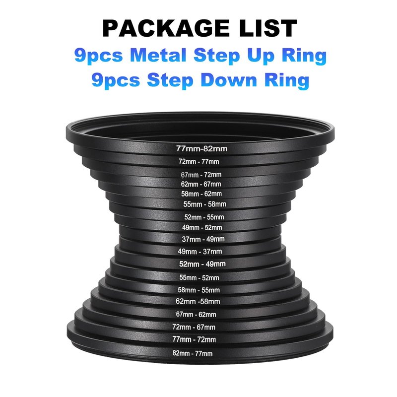 - ⭐Include 9 PCS step up rings filter ring adapter set: 37mm to 49mm , 49mm to 52mm , 52mm to 55mm , 55mm to 58mm , 58mm to 62mm , 62mm to 67mm , 67mm to 72mm , 72mm to 77mm , 77mm to 82mm; ⭐Include 9 PCS step down rings filter ring adapter set: 82mm-77mm, 77mm-72mm, 72mm-67mm, 67mm-62mm, 62mm-58mm, 58mm-55mm, 55mm-52mm, 52mm-49mm, 49mm-37mm