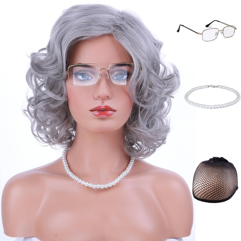 - Package:1 x Old Lady Wig; 1 x Wig Cap; 1 x Granny Glasses; 1 x Faux Pearl Beads Necklaces;