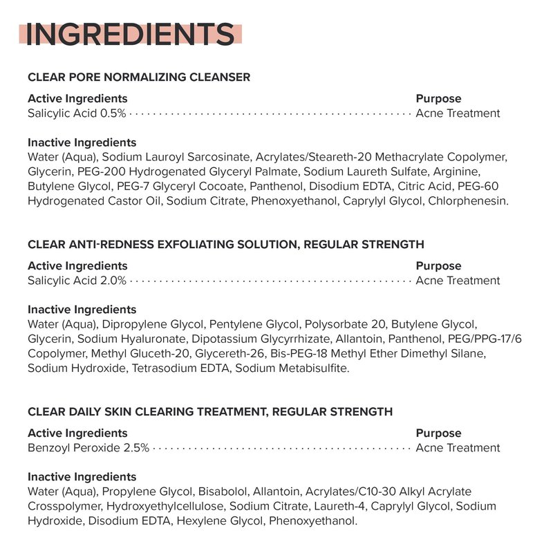 - Paula's Choice CLEAR Regular Strength Acne Kit contains 3 products: CLEAR Pore Normalizing Cleanser, CLEAR Regular Strength Anti-Redness Exfoliating Solution with 2% Salicylic Acid (BHA), and CLEAR Regular Strength Daily Skin Clearing Treatment with 2.5% Benzoyl Peroxide. It's suitable for normal, dry, oily & combination skin - including skin prone to cystic acne.