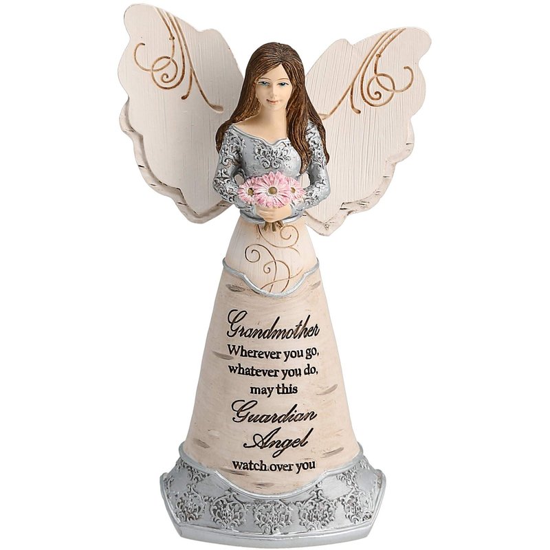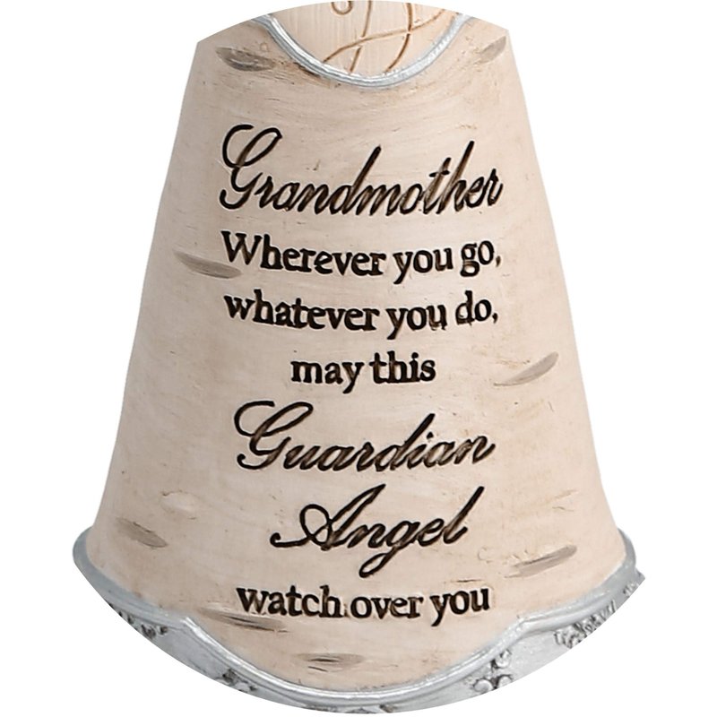 - IN-HOUSE DESIGN: "Grandmother Wherever You Go, Whatever You Do, May This Guardian Angel Watch Over You" text is debossed and painted onto the front of the angel, alongside an intricate silver design and pink flowers.