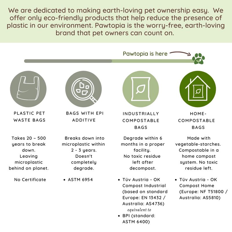 - Purely compostable dog poop bag (120 bags, 8 rolls): Pawtopia supports sustainable living and does not harm the environment (unlike plastic bags). Our biodegradable dog poop bags, made with vegetable starches (corn starch), are 100% home compostable and break down into natural substances such as water, Co2, and biomass. Our biodegradable poop bags are certified with OK Compost Industrial under EN 13432 (equivalent to ASTM6400), and OK Compost Home by Tüv Austria under AS5810/ NF T51800.