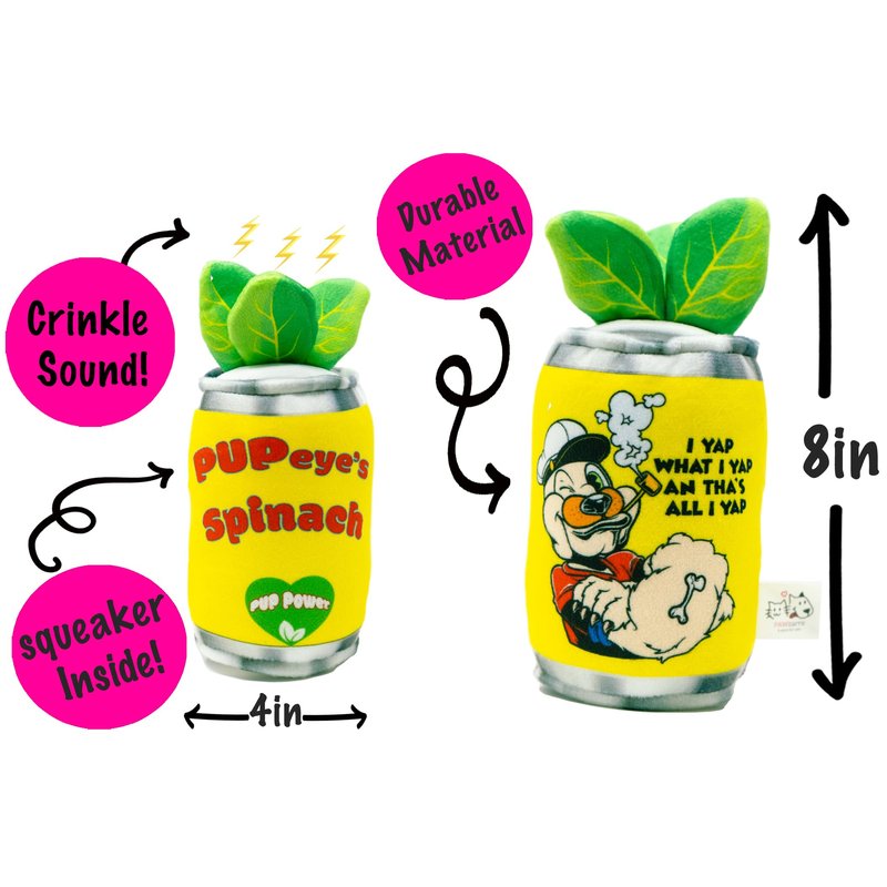 - WHIMSICAL PUPEYES CAN OF SPINACH DESIGN- Add a touch of humor to your dog's playtime with our hilarious Pupeyes Spinach can design. it looks like your furry friend is enjoying a snack alongside you, making this toy a great conversation starter and ensuring you never snack alone.