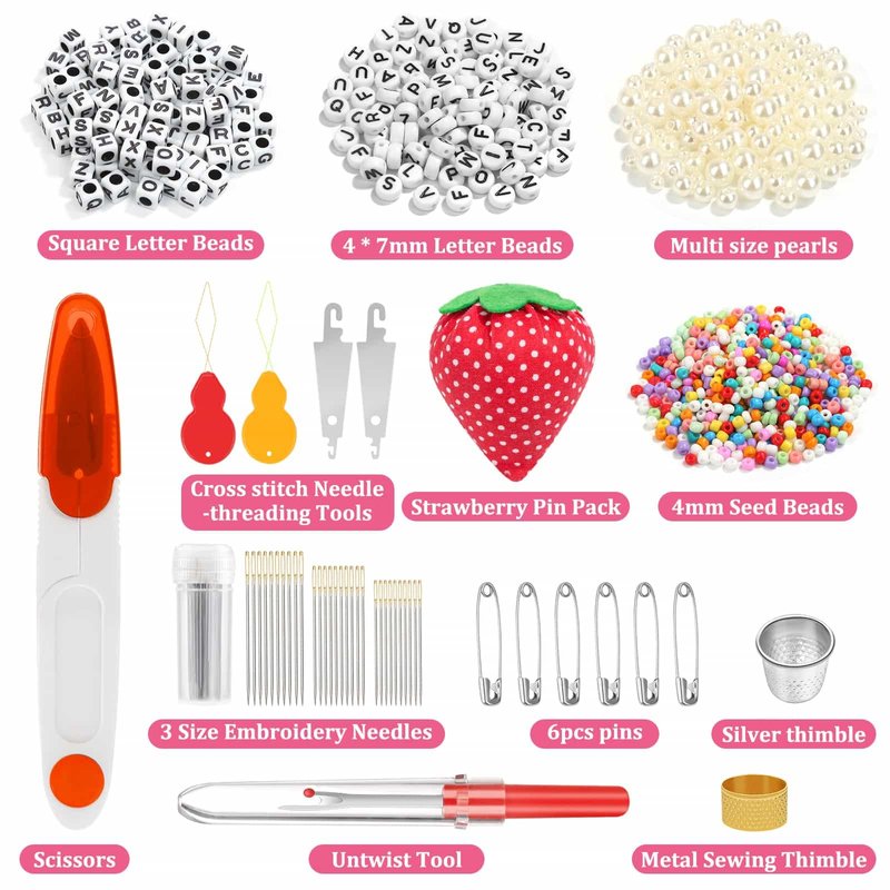 - Friendship Bracelets & Embroidery Accessories –200pcs letter beads, 130pcs pearl beads with 3 sizes and 500pcs colorful glass seed beads which is good for making your own personalized cute bracelets. 30pcs embroidery needles, 6 pcs safety pins,4 pcs cross stitch needle-threading tools,2pcs metal sewing thimbles,1 pair of scissors,1pc seam ripper, 1 pincushion, these embroidery tools are practical for cross stitch beginners. A great kit for making friendship bracelet or embroidery