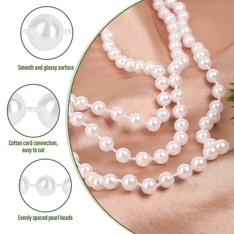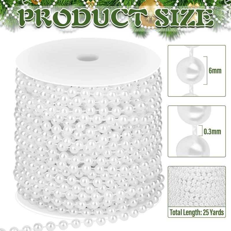 - 🎄MEASUREMENT – The pearl bead garland is 25 yards in length, and the pearl string beads are 6 mm in diameter, the length of the string between the beads is 3mm, and the spacing between the beads is evenly distributed. It makes the whole pearl beads chain look especially elegant and beautiful