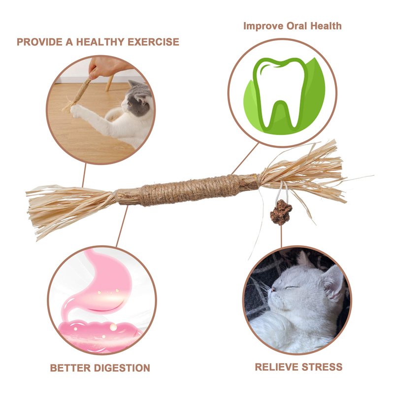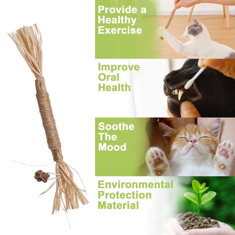 - Silvervine Cat Chew Sticks (Matatabi): Cat teething chew toys are enriched with actinomycin and B-phenylethanol. The scent is very appealing to cats and helps them relieve stress and stay energized and happy. 100% NATURAL: Our Silvervine (Matatabi) Sticks are made from 100% natural silvervine (Matatabi) sticks, raffia fiber, sisal rope and galls (silvervine (Matatabi) fruit) and bells. (Matatabi) fruit) and bells. Feel free to play with them when you give them to your cat, as they are absolutely safe for chewing and biting. This product is made of relatively good materials and other similar products are very different, the quality of the pet to use the assured!