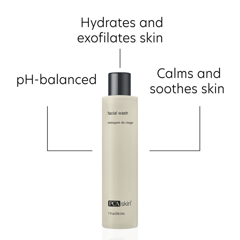 - PCA SKIN Facial Wash hydrates and exfoliates sensitive skin and gently removes makeup, oil, dirt, and other environmental impurities for a smoother, soothing feel