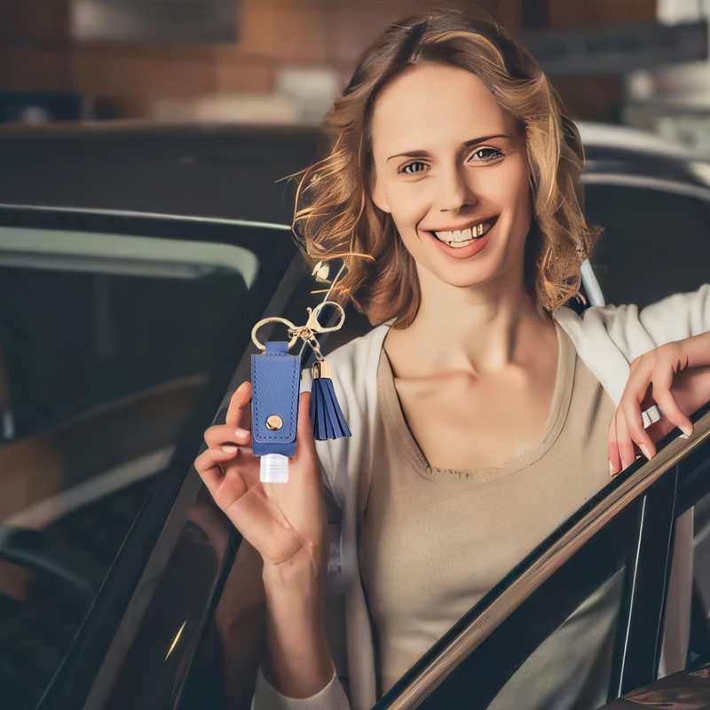 Product name: PU leather hand sanitizer keychain Color: black, pink, blue Material: PU leather Product size: 3.93*1.18inch Packaging: opp bag Packing list: 3 reusable hand sanitizer bags
