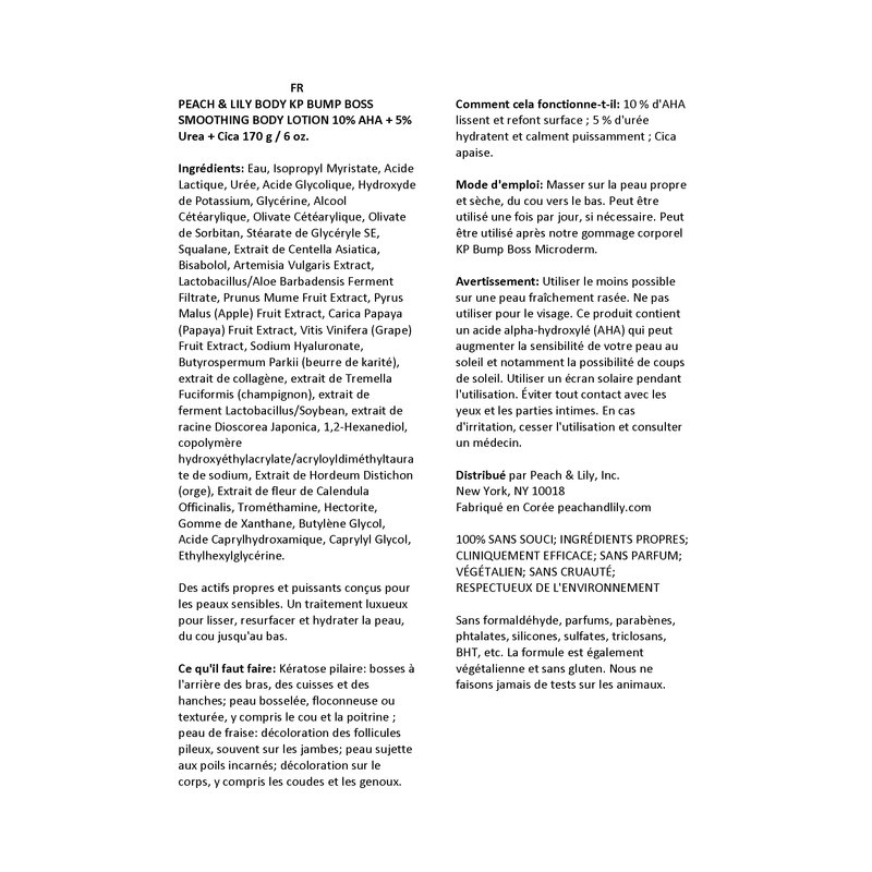 Introducing the Peach & Lily KP Bump Boss Smoothing Lotion - Your Ultimate Solution for Velvety, Radiant Skin! Are you tired of dealing with pesky body bumps, rough patches, and dry skin from the neck down? Look no further! Our luxurious KP Bump Boss Smoothing Lotion is here to transform your skin, making it smoother, softer, and more radiant than ever before. Don't miss out on the chance to transform your skin and elevate your confidence. The Peach & Lily KP Bump Boss Smoothing Lotion is your go-to solution for luxurious, head-to-toe skincare. Unleash your skin's natural radiance and embrace the smooth, soft, and hydrated results you've been longing for. Upgrade your skincare routine today with Peach & Lily, and let your skin become the boss!