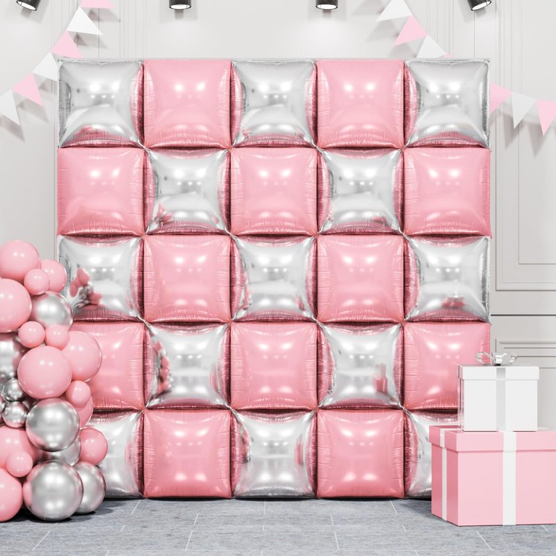 - Pearl Pink and Silver Square Foil Balloon Wall Kit:Transform your event with this exquisite backdrop set,featuring 25 pcs 19 inch square aluminum film balloons.Each balloon showcases a sophisticated design with a double-sided finish one side gleams in opulent pearl pink,while the other side dazzles in sparkling silver.This premium decoration enhances any setting,Create a striking visual impact and a memorable atmosphere with this versatile and stylish balloon kit.