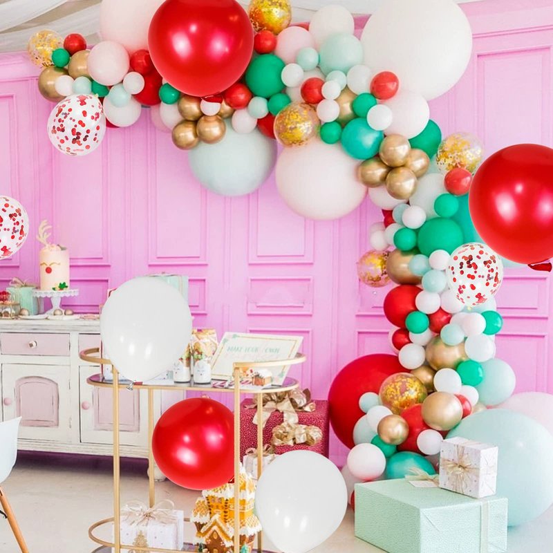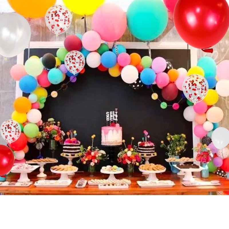- The red white party balloons kit contains 3 different latex balloons, royal red balloons, royal white balloons, red Confetti balloons, they are all 12 inch thick latex balloons. You can use the ribbon provided in the balloon package to keep the balloons linked together.