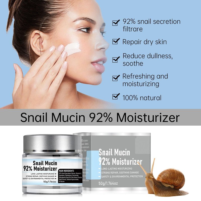 - Snail Mucin 92% Moisturizer: Snail mucin moisturizer contains 92% snail secretion filtrate to improve skin vitality by reducing dullness and soothing dehydrated skin.