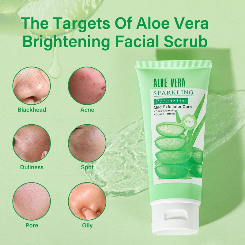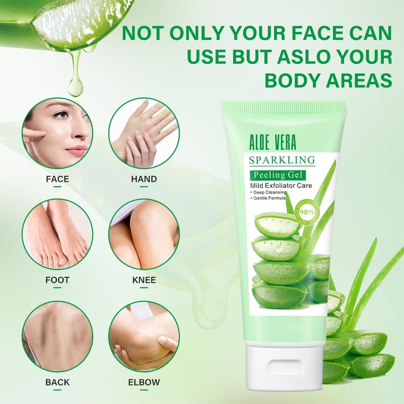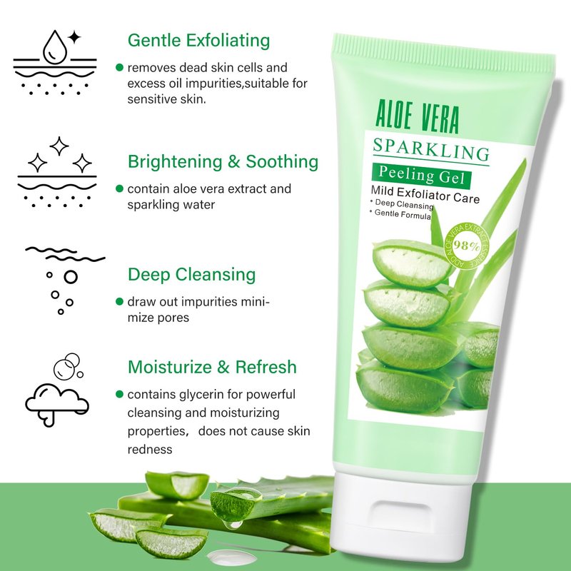 - GENTLE EXFOLIATING GEL : Aloe vera sparkling peeling gel Sparkling Peeling Gel effectively removes dead skin cells and impurities from the skin's surface, revealing a brighter and smoother complexion. it will not cause redness or irritation and will promote safe exfoliation. If you have sensitive skin, try this gentle exfoliating gel.