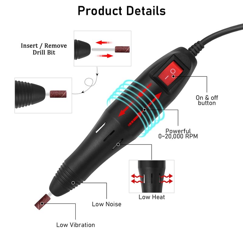 - Light weight and portable,low noise and vibration for smooth and long-time operation.Suitable for manicure,pedicure,cuticle trimming and even carving under the nail.Even if the gel and acrylic on the nail,it can help you remove quicker.