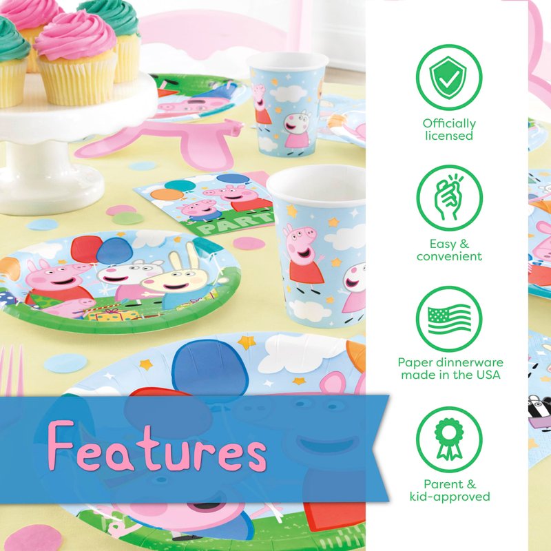 • Join Peppa Pig and George in throwing your child the Peppa Pig birthday party they'll always remember. This Peppa Pig Birthday Party Supplies kit contains everything you need for easy, fast setup and takedown. Party pack includes more than just disposable dinnerware--it also has festive decorations perfect for tying the room together.