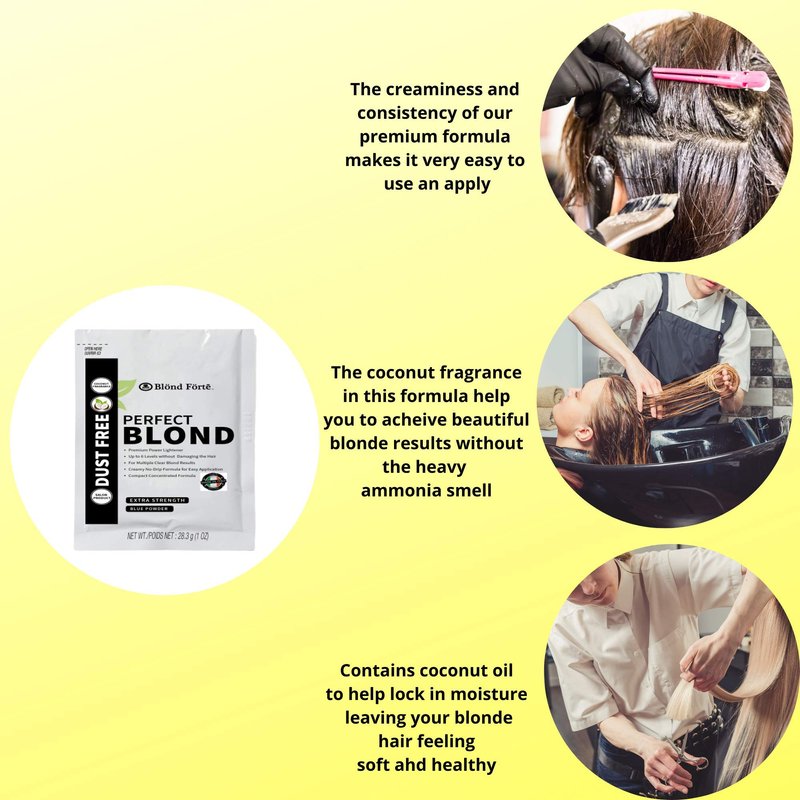 The Perfect Blond Dust Free Premium Hair Lightener is part of a line of professional hair products that are trusted by professionals around the globe. Blond Forte’s gentle yet professional-grade formulations make it a staple for stylists internationally. When you purchase Blond Forte products, you can be confident that you are purchasing a product that is free of unnecessary harsh ingredients. Items Included in this Offer: 1 Ounce (30 gram) Hair Bleach/Lightener (Made in Italy) 120ml Premium Creme Developer 1 Hair Coloring Brush 1 Plastic Salon Processing Cap 1 Pair of Non-Latex Nitrile Gloves (Color may vary) Two (2) Kits will be needed for Long Hair