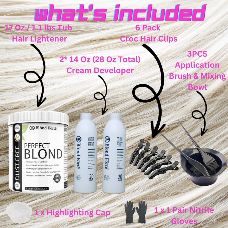 Enjoy Salon Quality Results with Perfect Blond Professional Hair Lightener If you’re trying to lighten your hair, create beautiful highlights, or go big and blonde you need a hair lightener that works quickly and consistently without drying out or damaging your hair or roots. We developed Blonde Forte Perfect Blonde as the perfect hair bleach lightener, so you can enjoy professional results without ever leave your own bathroom! Fortified with keratin and coconut oil to help nourish and hydrate your hair, our lightening powder locks in moisture and restores blonde vibrance easier and more effectively than ever before. Product Details: Hair Lightening Powder Professional Bleach Mix Creates a Smooth Cream No Heavy Ammonia Smell Works on All Hair Types Safe on Scalp and Hair Volume: 1.1 lb. Tub (17.6 oz.), 2x 14 Oz Developer, 3 PCS AHair Coloring Kit, Nitrile Glove, Processing Cap