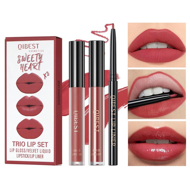 Our three-in-one lipstick set includes matte lip gloss, moisturizing lip gloss, and 2mm lip liner, making it a high-performance, multi-functional cosmetic product. The matte lip gloss provides a soft matte effect that stays all day, perfect for daily work and social occasions. The moisturizing lip gloss adds moisturizing ingredients to the matte foundation, keeping your lips hydrated and glossy, suitable for special occasions and dry seasons. The 2mm lip liner enables precise application and definition, ensuring you have perfect lip shape every time. The set includes three beautiful shades that are suitable for any skin tone. This set is a must-have for any makeup enthusiast, helping you create perfect lips for both daily makeup and special occasions. Come and give it a try!