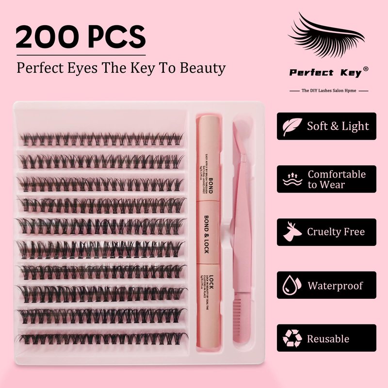 - This natural look cluster lash kit with glue bond and seal is affordably priced, making it accessible to everyone. Perfect Key 200pcs DIY lash extension kit waterproof offers a cost-effective alternative that allows you to achieve the same results at home. Perfect Key is committed to provide great false eyelashes with glue or no glue and better customer services. If you have any problems, please let us know via Amazon anytime.