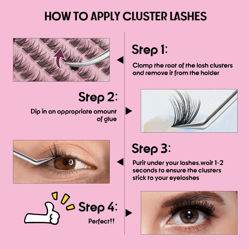 - Self adhensive lashes are the best false eyelashes for at-home application. These effortless press-on cluster eyelashes do not need pro-level measuring or trimming required. Designed for beginners to "Pick and Press" , these pro-glued cluster lashe extensions are so easy to apply:pick it up with a tweezer, position lash clusters under the lashline and squeeze them together with natural lashes.